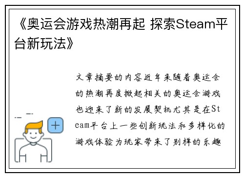 2024年巴黎奥运会即将揭幕,全球的目光再次聚焦于这一国际体育盛事。作为奥林匹克运动历史上的重要一届,巴黎奥运会无疑会成为全球体育爱好者、媒体以及各界观众的焦点。本文将从赛事创新、场馆设计、科技应用和文化传承四个方面,详细阐述2024巴黎奥运会的亮点,展示这场历史性赛事的独特魅力。同时,结合这些亮点...